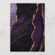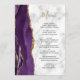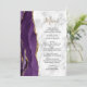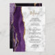 The left-hand edge of this elegant modern wedding menu features a purple watercolor agate border trimmed with faux gold glitter. The customizable text combines gold-colored handwriting script and black copperplate font on gray and white marble background. The reverse side features a matching purple and gold agate design.