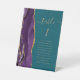 The left-hand edge of this elegant modern wedding table number pedestal features a purple watercolor agate border trimmed with faux gold glitter. The word "table" appears in whimsical gold-colored script on a teal blue background. Add the names of your guests who are assigned to each table.