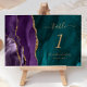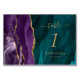 The left-hand edge of this elegant modern wedding table number card features a purple watercolor agate border trimmed with faux gold glitter. The customizable text combines gold-colored handwriting, and italic and copperplate fonts on a teal blue watercolor agate background.