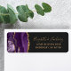 The left-hand edge of this elegant modern wedding invitation return address label features a purple watercolor agate border trimmed with faux gold glitter. The customizable text combines gold colored handwriting and copperplate fonts on an off-black background.