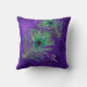 "Purple Gold Glitter Girly Modern Peacock Feathers Throw Pillow with Monogram and script calligraphy name." Bright and colorful, chic, elegant and fun design with glitter peacock feathers over a gold sparkling modern shimmer background. Graphically designed by internationally licensed artist, Audrey Jeanne Roberts, copyright.