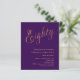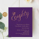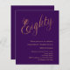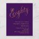 A modern, stylish invitation for a 80th birthday party. A purple colored background and the word Eighty written with elegant large script letters in faux gold. Personalize and add a name and party details.