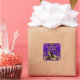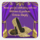 Womans purple and gold high heel shoes birthday party favor stickers with beautiful gold glitter high heel shoes on a purple and gold curtain background. This elegant purple and gold birthday party favor sticker is easily customized for your party or event by adding your text.