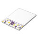 This fun soccer themed notepad features randomly arranged purple, gold & white soccer balls of varying sizes at its bottom edge with easy-to-personalize name & monogram on a coordinating purple circle pendant plus jersey number on one of the soccer balls - by katz_d_zynes
