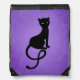 Elegant black cat bag with a beautiful illustration of a gracious evil black kitty with glowing eyes on a night watch on textured purple background.