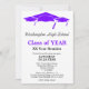 This vertical format minimalist class reunion invitation design features black and purple text on an all white background with three purple graduation caps as the top border. Personalize your information, remove information or edit using the design tool to select a font color, size, and style your prefer.