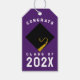 Creative graduation gift tags featuring graduate congrats design, featuring black cap with gold tassel on purple background. Edit text to add year.