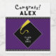Creative graduation gift labels and party decor featuring classic black graduation cap and gold tassel design on purple background. To personalize edit text to add name and senior class year.