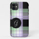 Monogram iPhone 5 case designed with a funky plaid pattern in purple, green, and black, and personalized with your initial in white over a black circle.