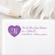 Chic wedding return address labels, done in white, with a purple glittery looking heart, on the left side, with a white one letter monogram. Personalize the purple text and monogram, to suit your needs.