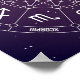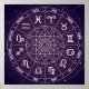 Wall decor featuring a purple illustration by Freepik of an Astrology wheel with zodiac signs. Soothing blue and purple theme. New Age theme.