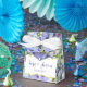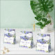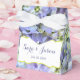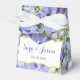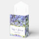 This wedding favor tent box with white ribbon features a photograph of full bloom purple hydrangeas. A white bracket shaped box on the front under the flap features customizable text for the names of the bride and groom and their wedding date.