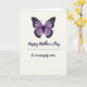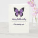 This greeting card features a graceful winged insect centered near the top, its wings shaded in deep lavender and rich purple with black outlines and small white spots that feel like tiny lights. A soft blush-pink tint runs along the slender body, adding a gentle, caring touch that reads like a quiet hug ❤️. The insect rests against a muted cream background, giving the scene lots of breathing room and a calm, intimate tone. Beneath it, a thin grey horizontal line acts as a divider, like a pause before the message. The main text sits below the line in flowing purple lettering, with “Happy Mother’s Day” larger and the phrase “to an amazing mom” placed underneath in smaller type. The purple text echoes the wing colors, creating a sweet visual connection that feels affectionate and close 🌼. The wings show segmented panels with dark borders, and the white spots are scattered along the edges against the cream backdrop.