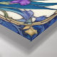 A purple iris flower with yellow accents, surrounded by green leaves and a blue floral border, art nouveau style, intricate details, vibrant colors, elegant design.