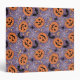 This design features a vibrant Halloween pattern with a playful and cute design. The pattern showcases bright orange jack-o'-lanterns with various cheerful and friendly expressions. These pumpkins are surrounded by a purple background filled with white spiderwebs, black bats, crescent moons, stars, candy corn, and small spiders. The overall theme is fun and festive, making it perfect for a lighthearted Halloween decoration or themed design. The color palette is a mix of traditional Halloween colors—orange, black, and purple—with added touches of white and yellow for contrast.