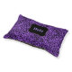 Stylish pet pillow done in a black and purple wild jaguar print. A black decorative plaque like text area, in the middle of the pillow, has purple text ready to personalize. Great for any pet.
