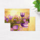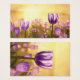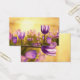 A golden sun rising over a field of purple tulips.