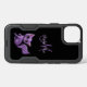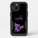 Cute anime style painted purple kitten with green eyes, a little purple bow, and a fluffy tail. He is in a sitting position with his body to the side and his face turned to the front with one paw raised. Your name name and initial display above the kitten in matching light and dark purple fonts. Shown on a black background. Artwork and design by Karlajkitty