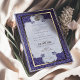 This exquisite wedding invitation captures the essence of traditional Muslim matrimony with its elegant lace design in a purple hue. The delicate intricacies of the border frame the page, leading the eye to the sacred Islamic calligraphy at the center top. The aged parchment-like background provides a vintage feel, while the ornate details around the edges resonate with the grandeur of classic Muslim art. The rich color palette of lavender, with accents of purple and cold white, evokes the feeling of a starry night, perfect for an evening of celebration. This invitation is not only a herald of the upcoming nuptials but also a keepsake of cultural beauty and significance.