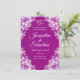 "An elegant and classic wedding invitation with vibrant purple background and delicate white lace border.