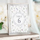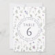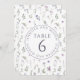 Timelessly elegant table numbers for weddings featuring purple lavender delicate flowers, complete with the names of the bride and groom.