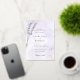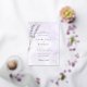 Elegant wedding invitation, featuring watercolor Lavender flowers and silver foil spatter. Presented on a sheer purple watercolor wash background.