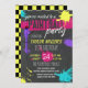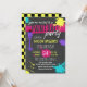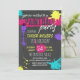Cool paintball party invitation with paint spatter against a dark background in purple, hot pink, yellow, and turquoise.