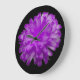 This awesome clock features a photograph of a marigold flower that has been manipulated to create a beautiful flower with stunning purple petals. The background is black to show the beauty of the flower to its fullest.