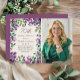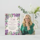 Celebrate a beautiful milestone with this elegant 70th birthday photo invitation. The design features a frame of watercolor roses, lilacs, and greenery in shades of purple and green, paired with stylish typography for the party details. A personalized photo of the guest of honor sits alongside the floral layout, creating a timeless and meaningful keepsake for family and friends. Perfect for honoring a special woman’s 70th birthday celebration.