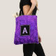 A purple, pink and blue ombre leaf foliage damask pattern on a rich, deep purple textured background adorns this modern and trendy monogramed tote bag. Makes a chic and stylish statement whenever you use it. A great gift for a friend, as well as yourself!