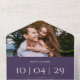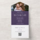 An elegant purple minimalist all-in-one wedding invitation featuring your photo, special date and wedding details set in classic, chic typography. The invitation includes a perforated RSVP card with your wedding website QR code and details. Designed by Thisisnotme©