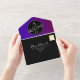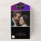 Simplistic, minimalist, modern, contemporary bold purple gold and black all-in-one wedding invitation with QR code, monogram with hand drawn love couple birds, trendy handwritten script and custom picture of the at the back.