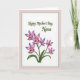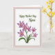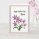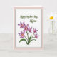 This greeting card features a bright white center panel edged by a thin, textured silver-gray line, all set within a wide muted rose-pink border that feels gently affectionate ❤️. Near the top of the white area, a flowing dark green line of text is centered and spaced with plenty of breathing room above the artwork. The lettering curves smoothly, like a soft note meant for a caring mother, and it sits high enough to keep the design feeling open and calm. Beneath it, a cluster of orchid-like blossoms spreads upward as if leaning in close, suggesting a tender, appreciative connection. The petals shift from pale lavender to deeper pink-purple tones, with warm golden-yellow centers that glow like tiny lights 🌼. Slender green stems and curved leaves sweep around the flowers, adding a natural rhythm that guides the eye back toward the message. The silver-gray border remains thin and slightly textured, framing the white panel against the rose-pink margin. The flowers gather in the lower half, with the tallest bloom reaching toward the centered dark green text above.