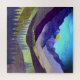 An abstract landscape with unique textures showing a purple and lavender mountain landscape with a stunning blue sky and flock of birds in shades of purple, lavender, beige, yellow, and pink.