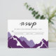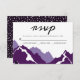 Purple mountains wedding RSVP response card. An elegant wedding design showcasing a mountain range and the text RSVP in handwritten style. The back includes white polka dot pattern on dark purple.