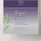 Elegant, modern, watercolor greenery dusty purple all-in-one wedding invitation with simple silver gray rope heart and custom picture of the couple at the back.