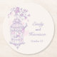 Cute bird couple in graphic drawing of open bird cage hanging from a blossoming spring tree with hearts. Fashionable modern chic wedding design part of the the bird cage romantic wedding stationary set. Pretty pastel shades of purple, pink and ivory cream. Edit these coasters with your own name and dates. Unique drawing and design by Sarah Trett.