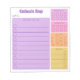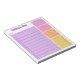 Practical notepad to help you keep track of your daily habits, making sure you drink enough water, stretch at least once every hour during an eight-hour work day, take the number of steps you need, and remember to take your meds or vitamins! There's also a handy to-do list with ten checkboxes so you can make your daily to-do list and check off each task you've finished. At the top, add your name in a bold purple font. The daily habits tracker is printed in color blocks of pink, purple, orange, and yellow.