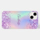 A trendy holographic background with unicorn and rainbow pastel colors in pink, purple, mint green. Personalize and add a name, written with a modern hand lettered style script