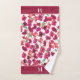 This colorful 3 piece bath towel set has purple, pink, and tangerine floral watercolor poppy images which fill up the pattern. Along with the various poppy images are soft green leaves and stems. It's virtually a kaleidoscope of color, and will definitely brighten any bathroom. On the bath towel and hand towel, each end has a solid matching border with your monogram. Be sure to see the matching shower curtain and bath mat in our store.