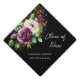 A stunning graduation cap topper featuring beautifully crafted purple and plum-hued flowers, elegantly designed in a gorgeous bouquet that adds a touch of sophistication. The vibrant floral arrangement stands out against a sleek black background, creating a striking contrast. This personalized piece can be customized with your name, class year, and school name, making it a unique and memorable way to celebrate your achievement.