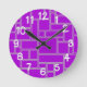 This all clock has a Bauhaus design of rectangles made with gray lines on a field of purple.