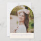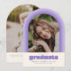 This fun retro inspired graduation announcement features space for a single photo on the front framed by an arch in shades of light purple. It also has space for the graduate's name, school, and class year. The back of the announcement has space for a second photo and more text.
