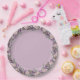 These paper plates have a pink and purple spring flower wreath border along the edge on a lavender background. Coordinates with the Easter Floral Cross collection.