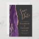 The left-hand edge of this elegant modern wedding save the date card features a purple watercolor agate border trimmed with faux rose gold glitter. The customizable text combines rose pink handwriting, copperplate and italic fonts on a slate black background. The reverse side features a matching purple and rose gold agate design.