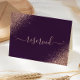This elegant, modern wedding table reserved seating place card features rose gold faux glitter in opposite corners. The word "reserved" appears in rose pink handwriting script with swashes before and after on dark purple background on both sides of the card.