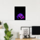 A beautiful photograph of a purple, blue and pink colored rose on a black background illuminated by a single spotlight creating spectacular lighting which really showcases the beauty of this flower, which is covered in delicate little water droplets.