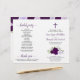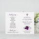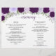 This beautiful program is designed for a Catholic ceremony. It features a rustic boho chic design with a hand painted watercolor roses in shades of purple, lavender, and plum. There is a crucifix or cross, with elegant script calligraphy for the names of the couples and titles. The inside has extended space for all of the details on the ceremony, while the back has information on the bridal party along with a short thank you note. Beautiful way to welcome your guests and make it easy for them to follow along with the ceremony.