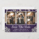 Rustic purple wedding photo save the date card featuring a photo collage on a barn wood background adorned with burlap and lace ribbon, baby's breath flowers and string lights. Ideal card design for a purple rustic country, garden, backyard or barn wedding party inspired by baby's breath flowers.
