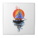watercolor artwork of a little boat with purple colored sails in front on a big red and orange colored sun on a ceramic tile.